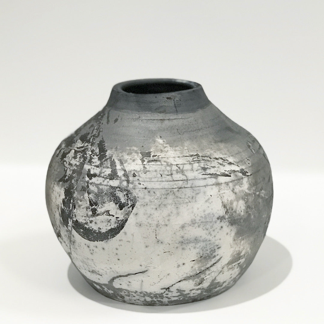 In raku, pottery is removed from the kiln when red hot. It is cooled rapidly, often with combustable materials causing it to catch fire in an enclosed space. Then the oxygen is reduced and the most amazing unique results come to surface. Due to the porous nature of the pieces, they are decorative and not meant to hold water.