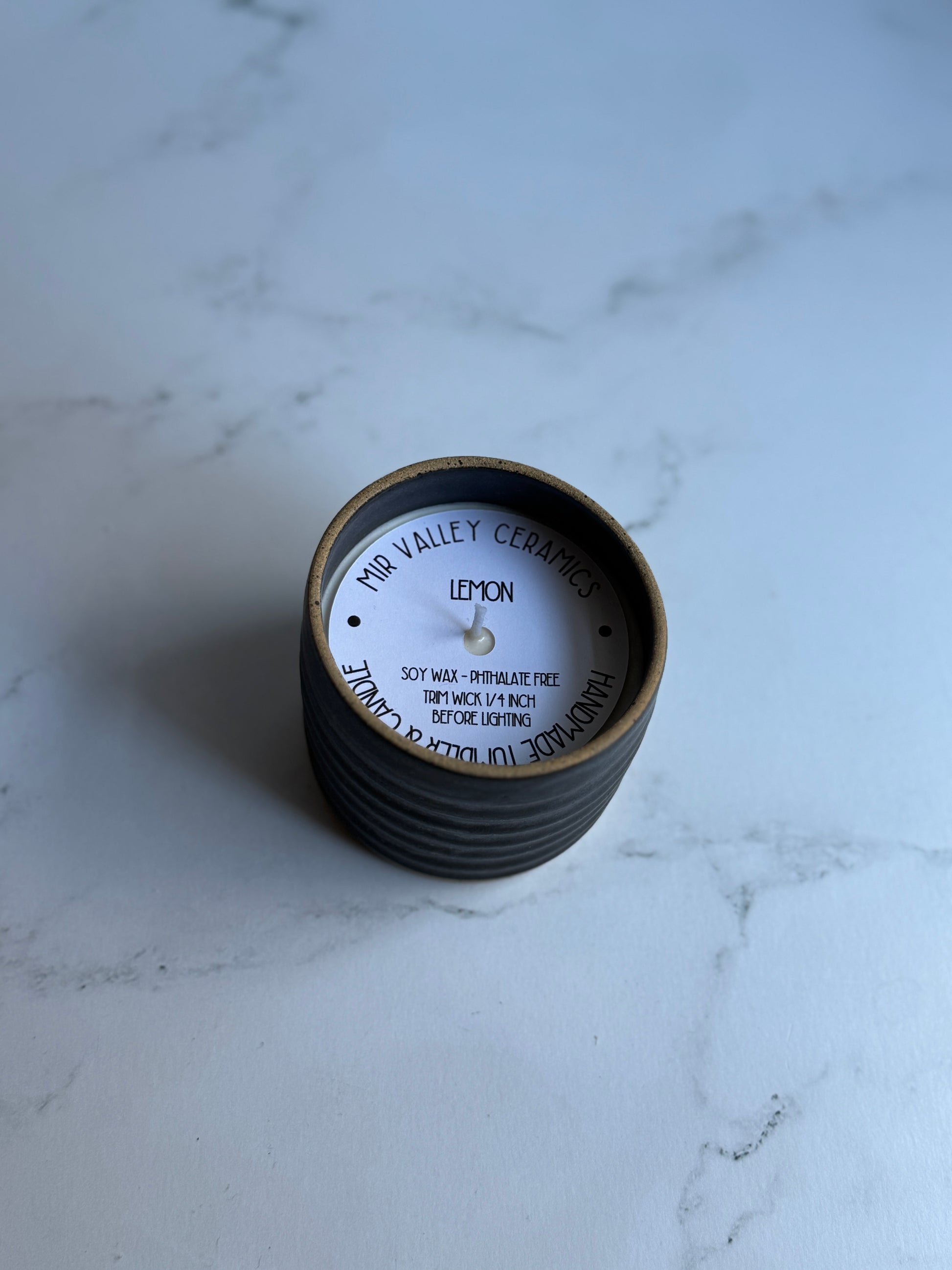 Handmade stoneware tumbler with textured pattern on outside. Candle is hand poured in small batches with phthalate free soy wax. The black candle has a light lemon fragrance and the translucent green candle has a light coconut fragrance.