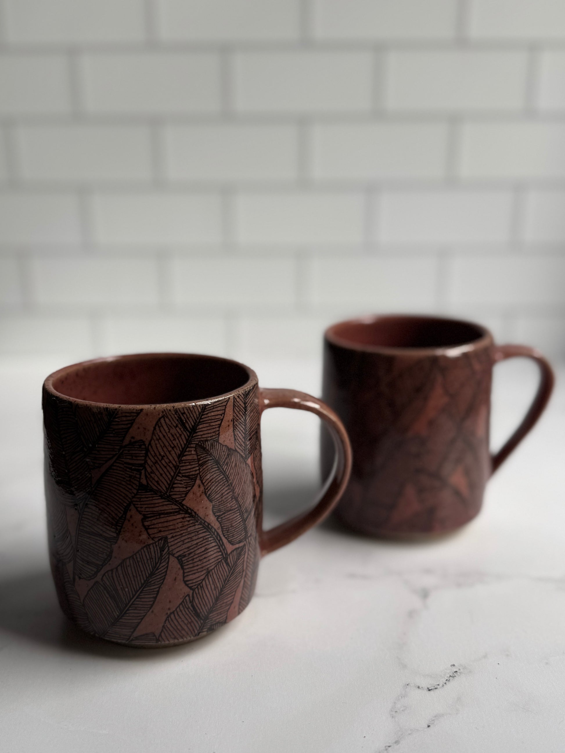 Handmade stoneware mugs with a banana leaf pattern and translucent mauve glaze on speckled clay.