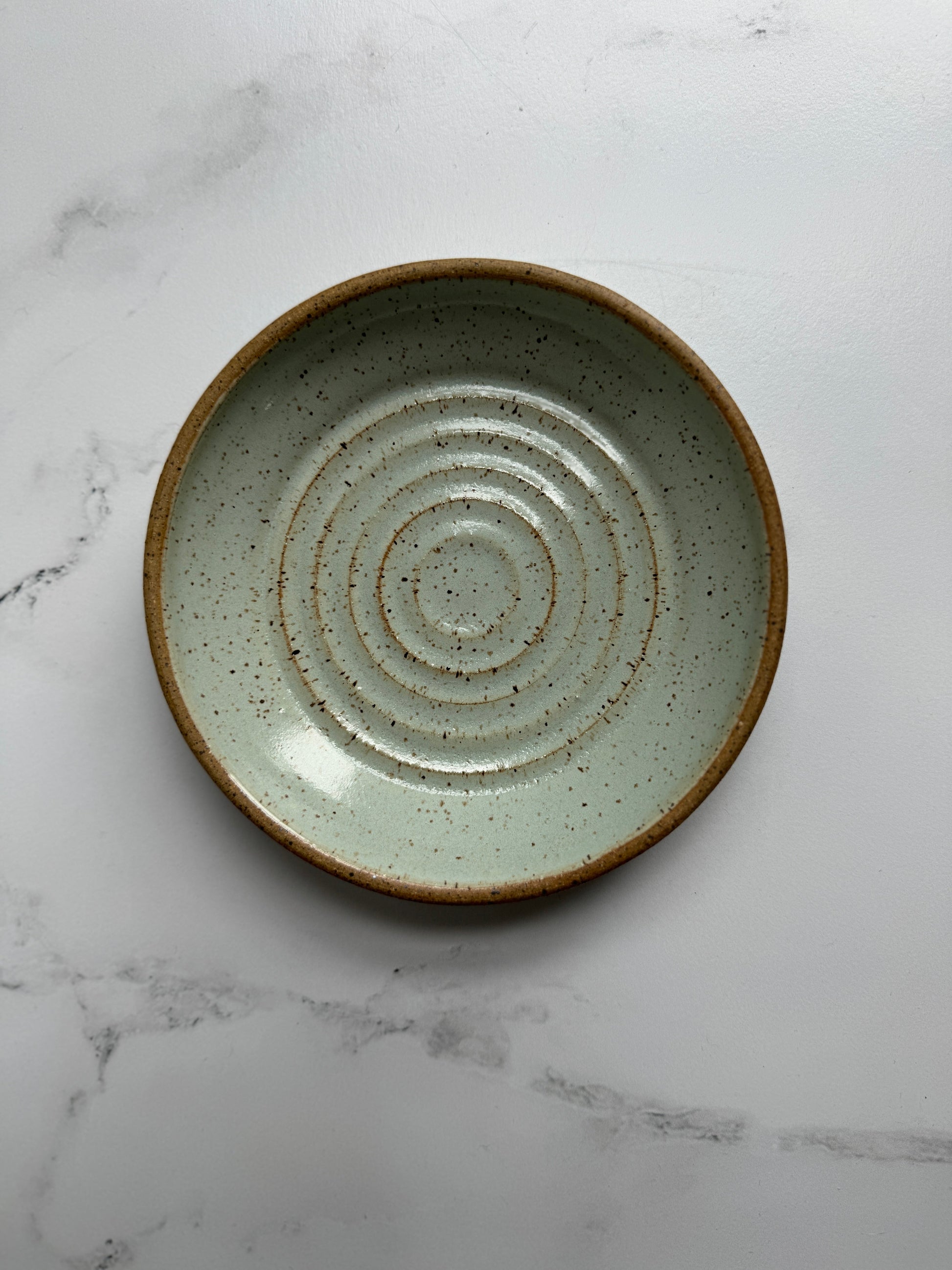 Handmade dishes crafted from stoneware. The speckled clay comes through the glaze, giving it a beautiful appearance. The rim of the dish is unglazed, adding a bit of contrast. Ideal for use under a bottle of wine.